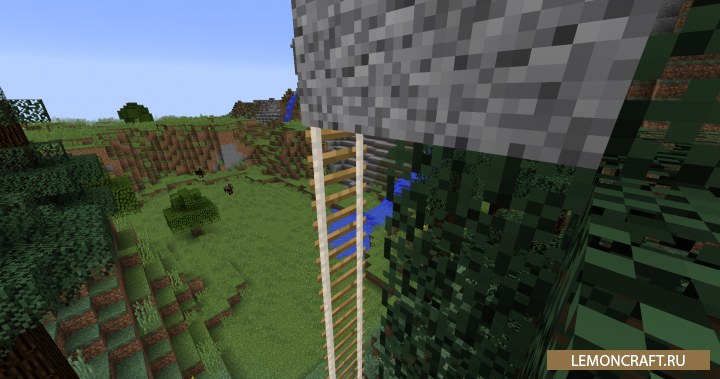Мод на веревочные лестницы Just A Rope Ladder добавит в игру новый вид лестниц, которые пригодятся в сочетании со скайблоками. Для установки данной лестницы вам достаточно установить одну единицу на блоке, а потом нажимая ПКМ продлеваете данную лестницу до нужного вам места.